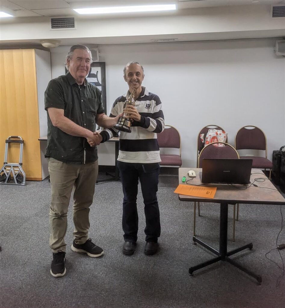 Director of Play Lee Forace (right) presents the Canberra Cup to the 2023 winner Brian Butler (23 March 2023).